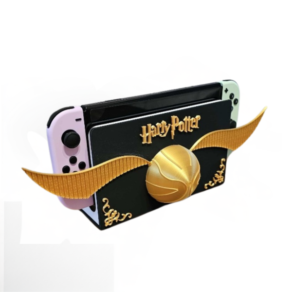 Este soporte 3D está inspirado en la Snitch Dorada, con alas en relieve y el logo clásico de la saga en dorado metálico. Diseñado para realzar tu consola y mantenerla segura, es el accesorio perfecto para fans del mundo mágico.